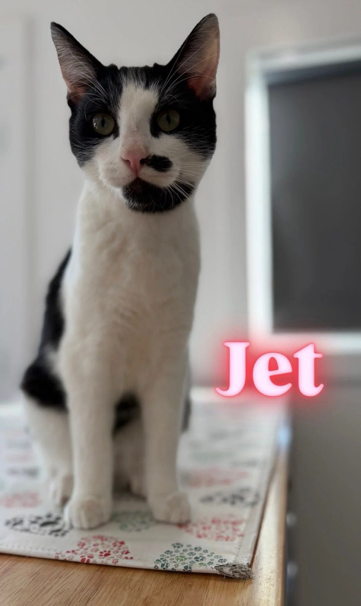 Jet is a male, white and black, domestic short-haired cat. He was born July 1, 2025. He is neutered, vaccinated, and mircochipped. He is a playful and vocal cat. He loves chasing around his feathered wand and laser pointer and scratching his cardboard. He has not been tested around dogs or other cats outside of his mom and siblings.