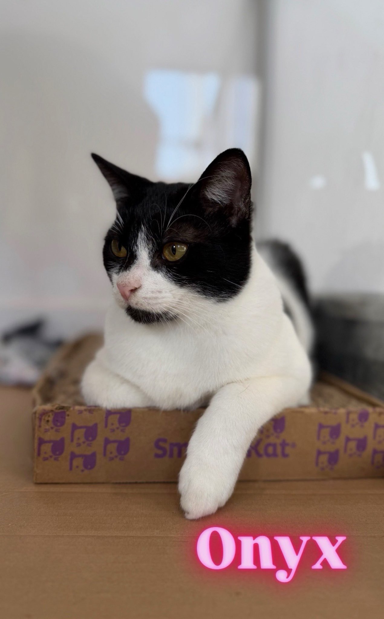 Onyx is a female, white and black, domestic short-haired cat. She was born July 1, 2025. She is spayed, vaccinated, and mircochipped. Onyx is a timid and shy cat who enjoys playing in tunnels, playing hide and seek, and climbing her cat tree. She has not been tested around dogs or other cats outside of her mom and siblings.
