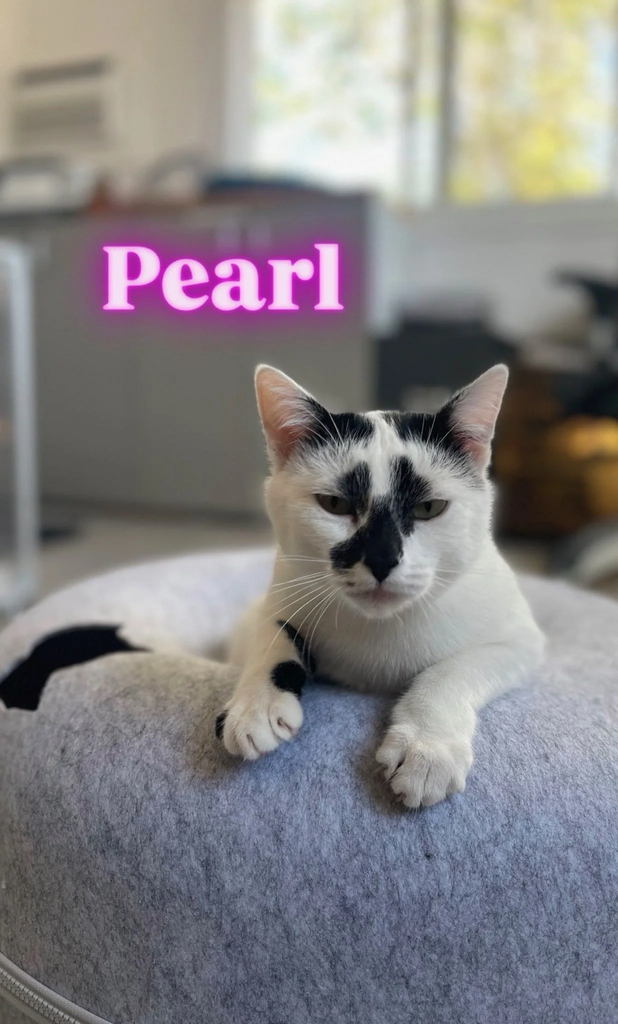 Pearl is a 2-3 year old, domestic short-haired female cat. She is spayed, mircochipped, and vaccinated. She was a pregnant stray and came to the rescue after having her kittens on July 1, 2025 to nurse and care for her kittens in safety. She is a friendly cat who craves attention and pets. She does well with chidren. She has not been tested around dogs or other cats.