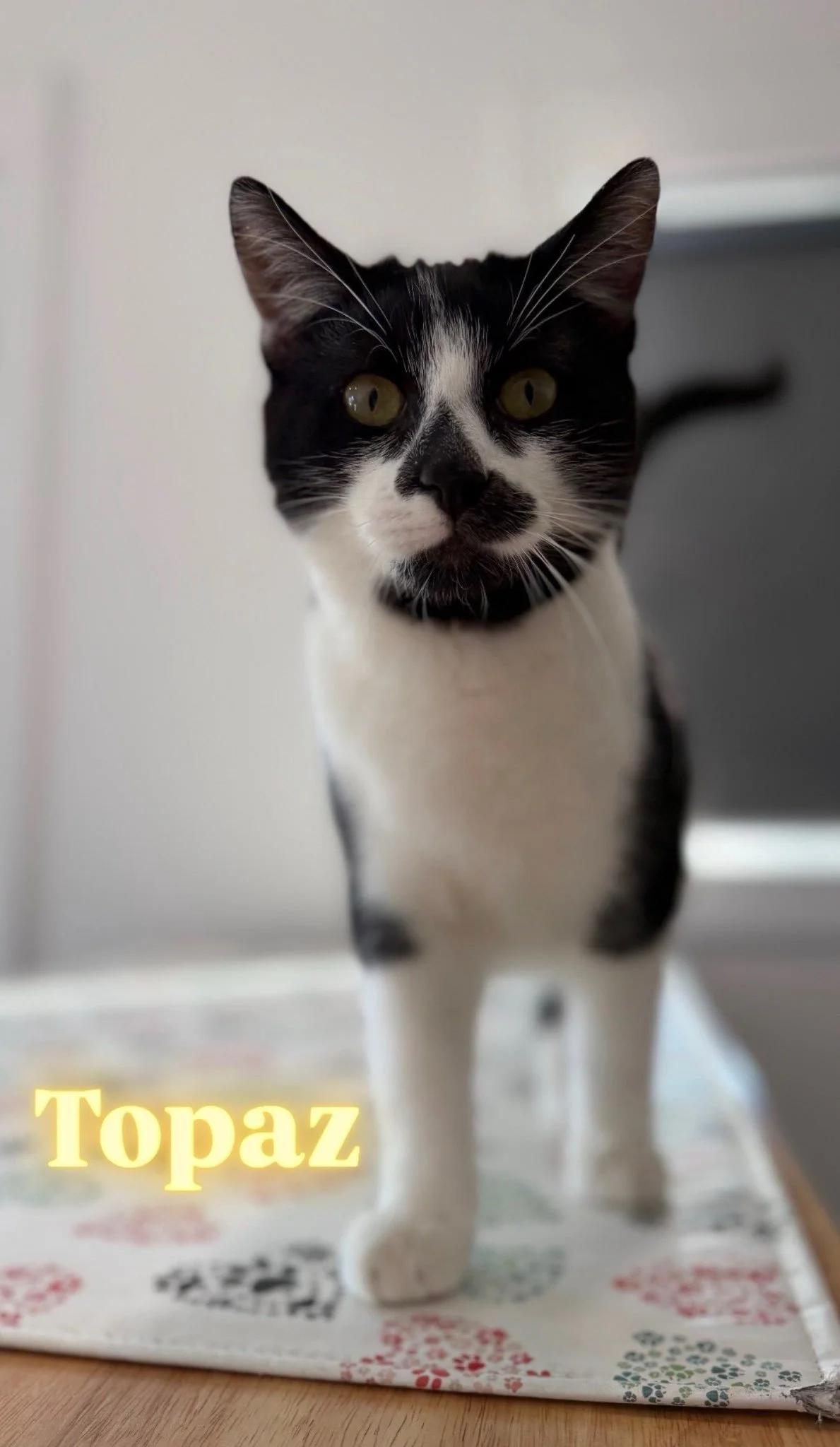 Topaz is a male, white and black, domestic short-haired cat. He was born July 1, 2025. He is neutered, vaccinated, and mircochipped. He is a sweet, mild mannered cat who likes playing with toys and his siblings. He is very curious and enjoys jumping on counters and tables to explore. He has not been tested around dogs or other cats outside of his mom and siblings.